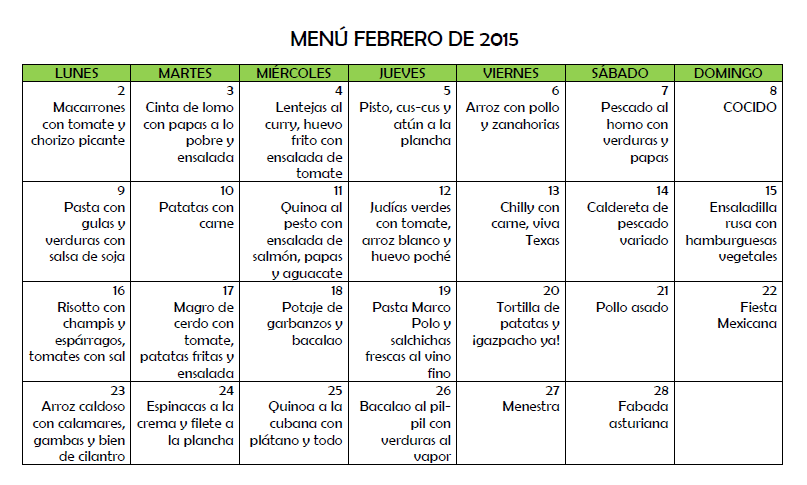 Si lo quieres en Pdf para tu nevera pincha MENÚ FEBRERO DE 2015