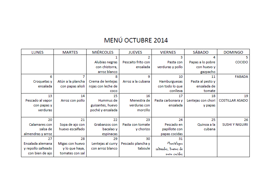 Como estoy un poquito overwhelmed (o sea, liada-requeteliada) hace mucho que no pongo una receta de verdad. Espero que eso cambie este mes. Os dejo el MENÚ OCTUBRE 2014 (Pdf para descargar). Como veréis he puesto más legumbres y muy poca carne. En esta casa estamos tirando al vegetarianismo activo pero bueno, sin pasarse, un domingo hay costillas asadas… Ya sabéis que sólo es indicativo y que os lo podéis saltar cuando más os convenga. Si tuvieras cualquier duda no tienes más que preguntarme.