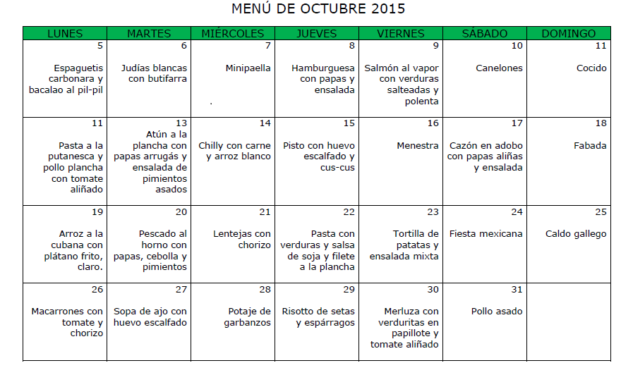 O mejor sería decir, lo que queda de noviembre… ¡Se me había olvidado poner el MENÚ DE NOVIEMBRE 2015! Mil perdones! Como soy de la era analógica, con un papel y un boli me apaño de lujo (el menú a boli está en mi nevera desde el día 2); y luego se me olvida que tengo blogs y que hay que rellenarlos cual redondo de ternera.