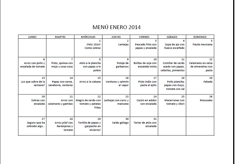 ¿Qué comemos hoy? Es la pregunta que ha de ser respondida every day. Bueno pues verás, yo hago un menú mensual para tener esa cuestión resuelta. Hay días que no tengo ingredientes para hacer lo que toca y hago otra cosa, no pasa nada. Sólo es una pauta para no estar todos los días con lo mismo.