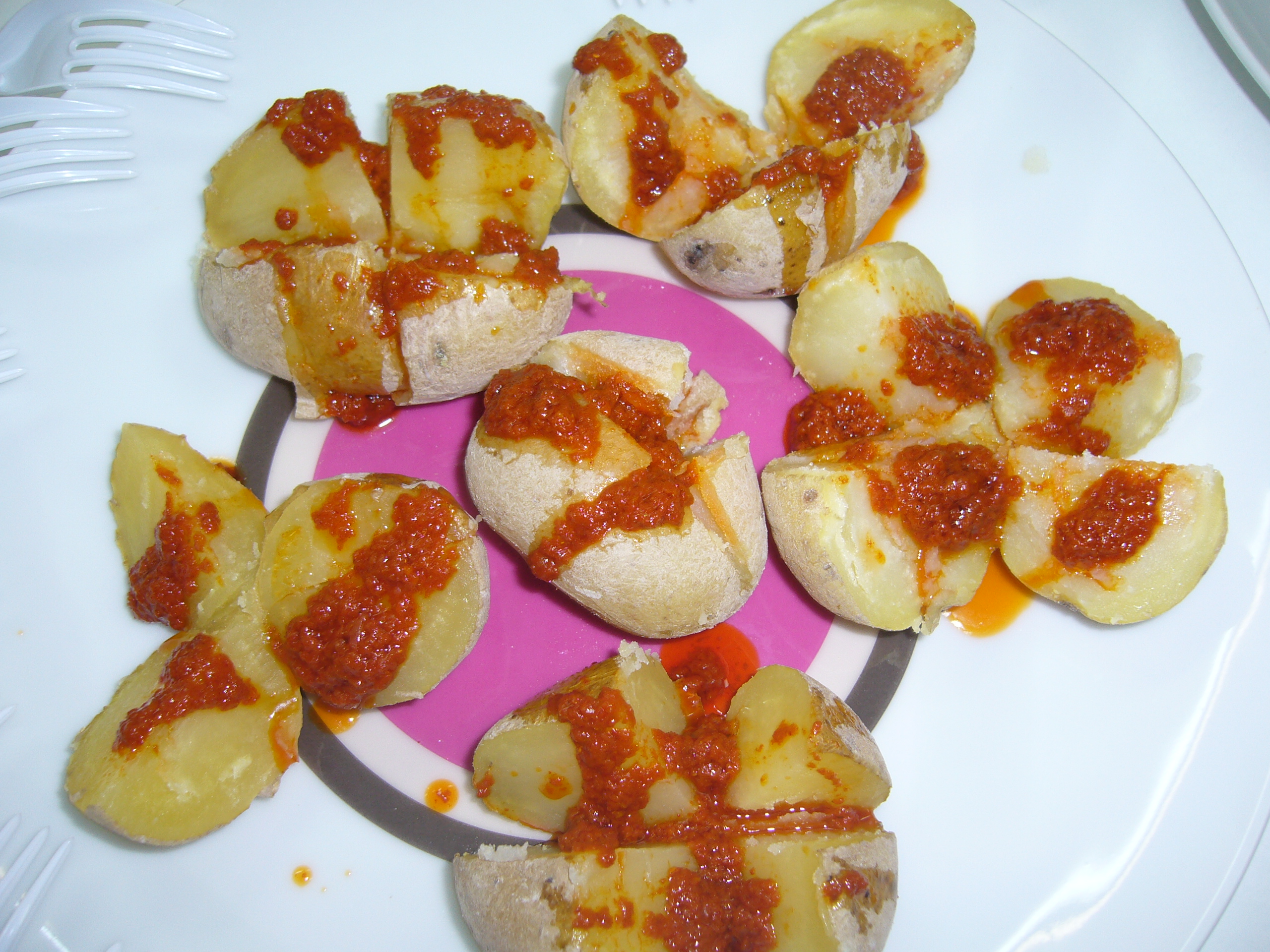 Ponemos las papas en un plato y regamos unas cuantas con el mojo rojo y otras con el verde. Al irlas comiendo se van partiendo y empapando de los mojos.