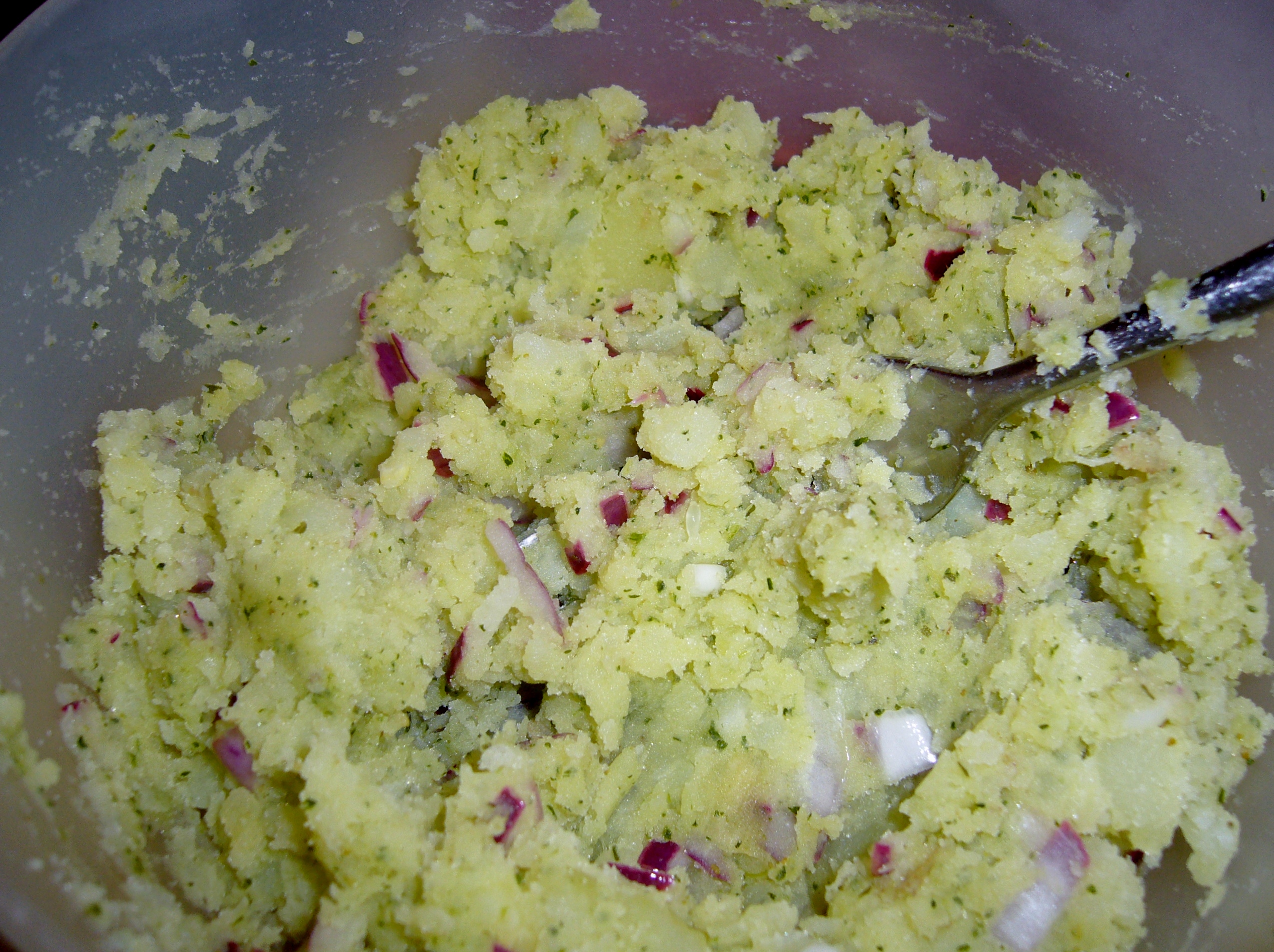 Primero la patata, la aplastamos bien con una cucharita y seguimos.