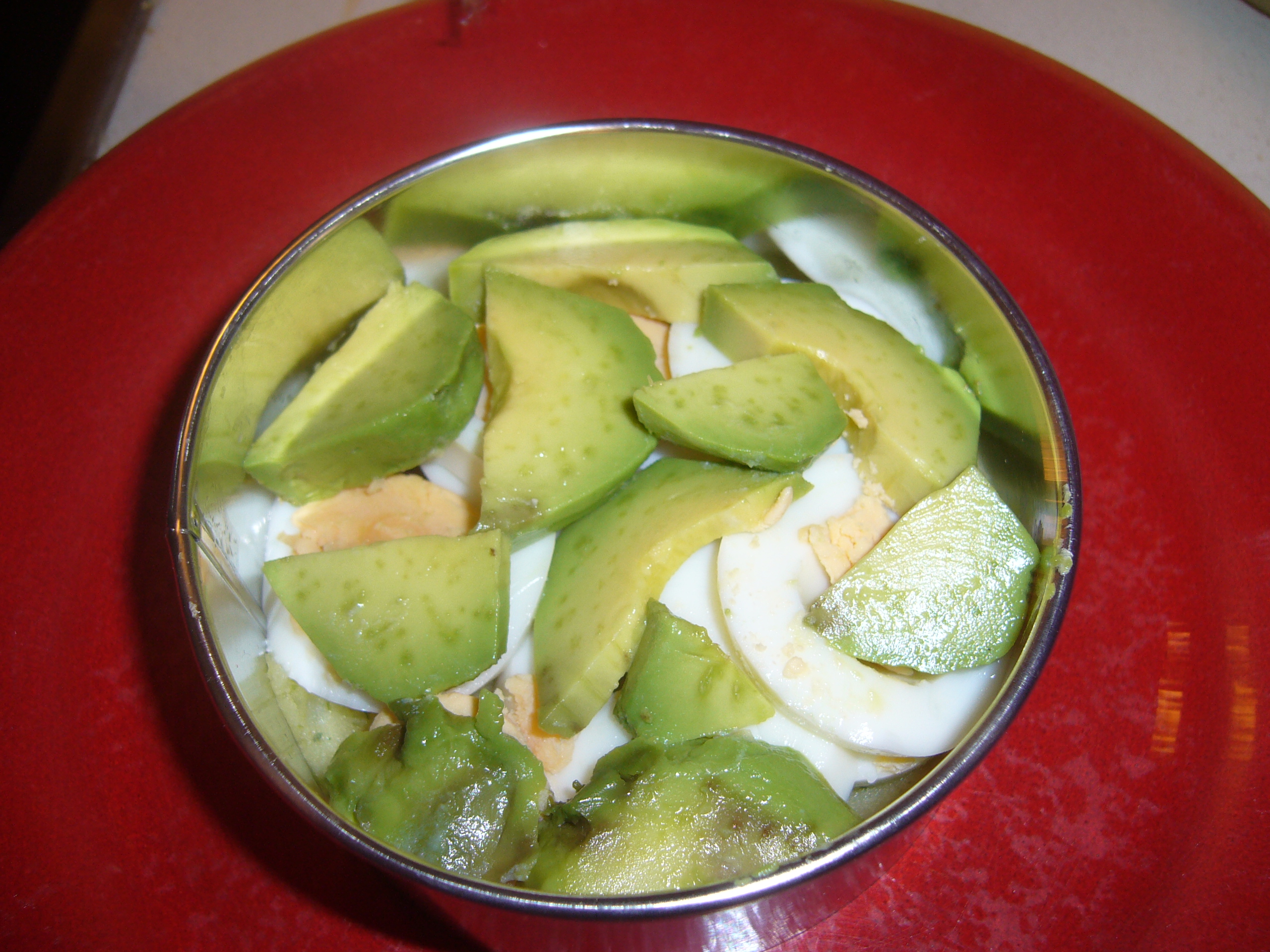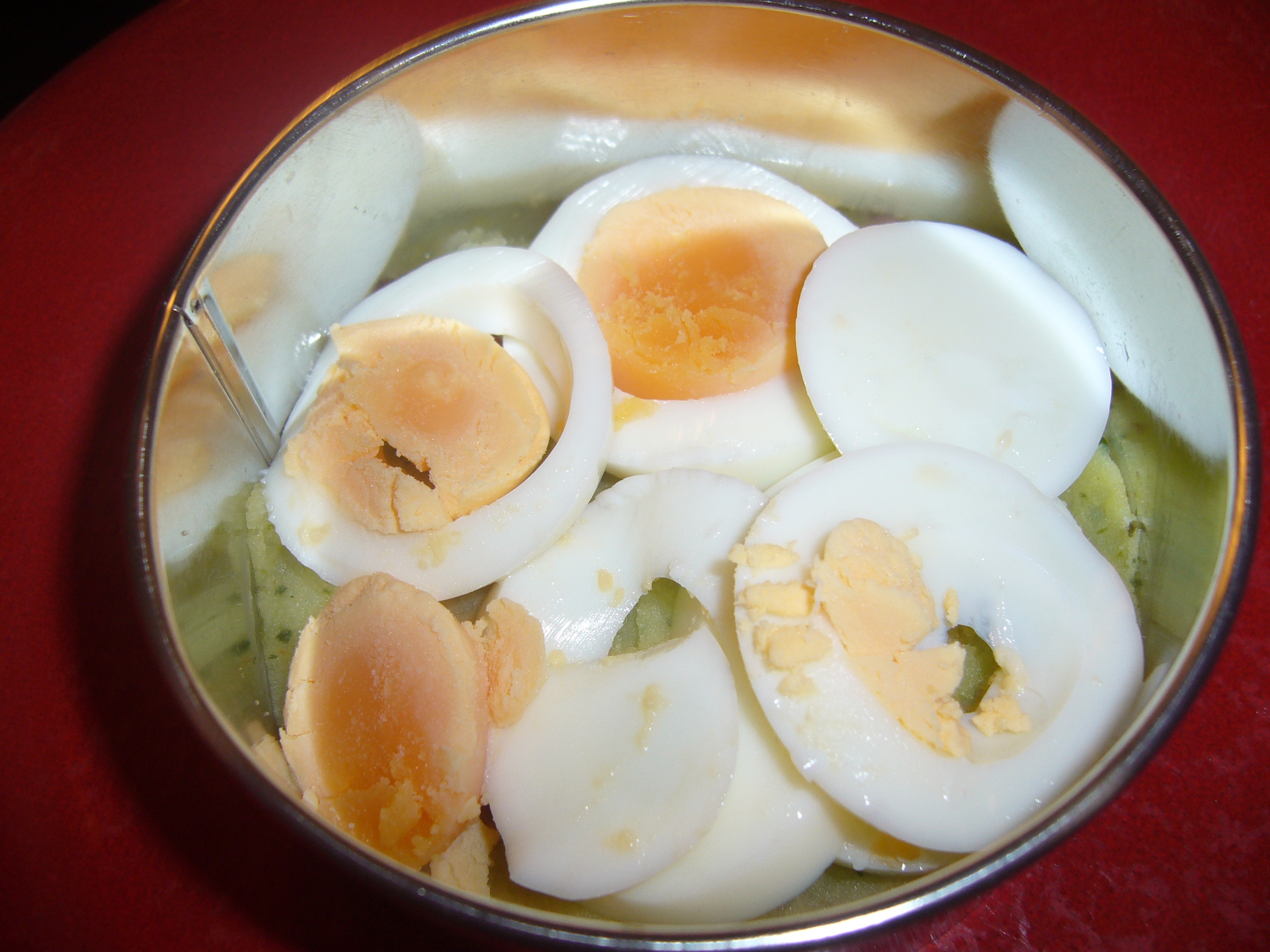 El huevo cocido partido en rodajas. Moja el cuchillo para que no se te deshaga el huevo. Y aún hay más: