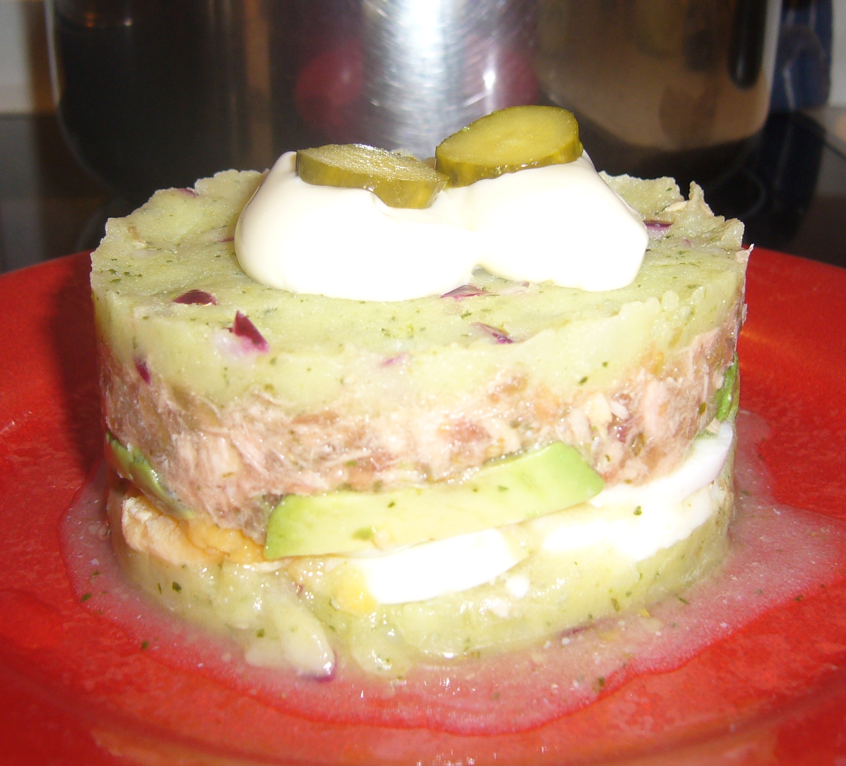 Ha soltado juguito del tomate y del atún, estaba muy jugosa, llena de sabor, ligera, sorprendente, buenísima. Ya sabes que no hago nada como pone la receta pero, en internet hay recetas ortodoxas de causa limeña. Es un plato peruano, fácil, barato y con múltiples combinaciones.