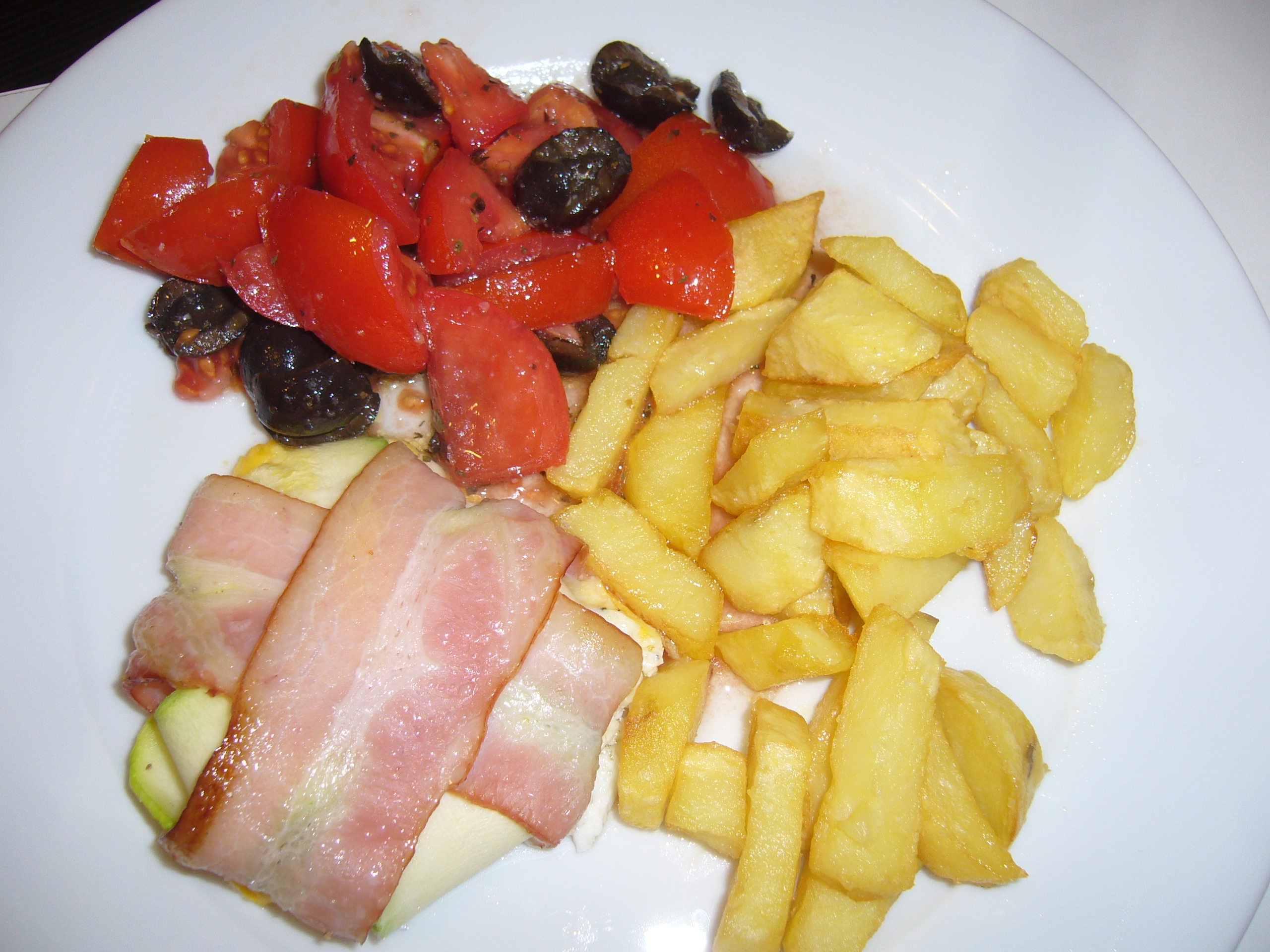 Como ves, hice patatas fritas y ensalada de tomate con aceitunas negras. Así era un plato completo y único, no suelo poner primero, segundo y postre. La digestión es mucho menos pesada, sobre todo, si te has ocupado de masticar la comida y tomarte el tiempo de comerla con deleite, nunca con prisa. Si nos quedamos con hambre nos comemos una fruta o un flash de postre.